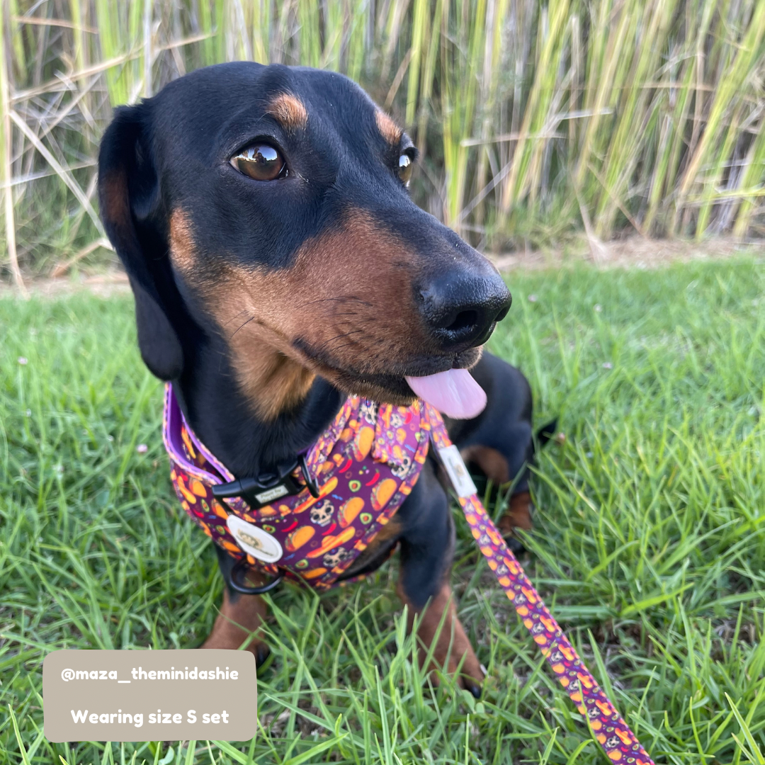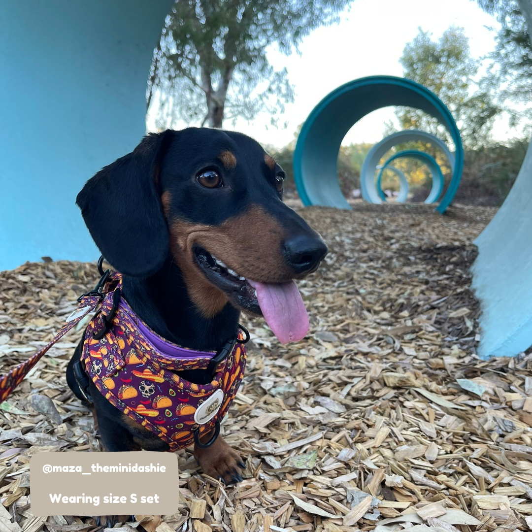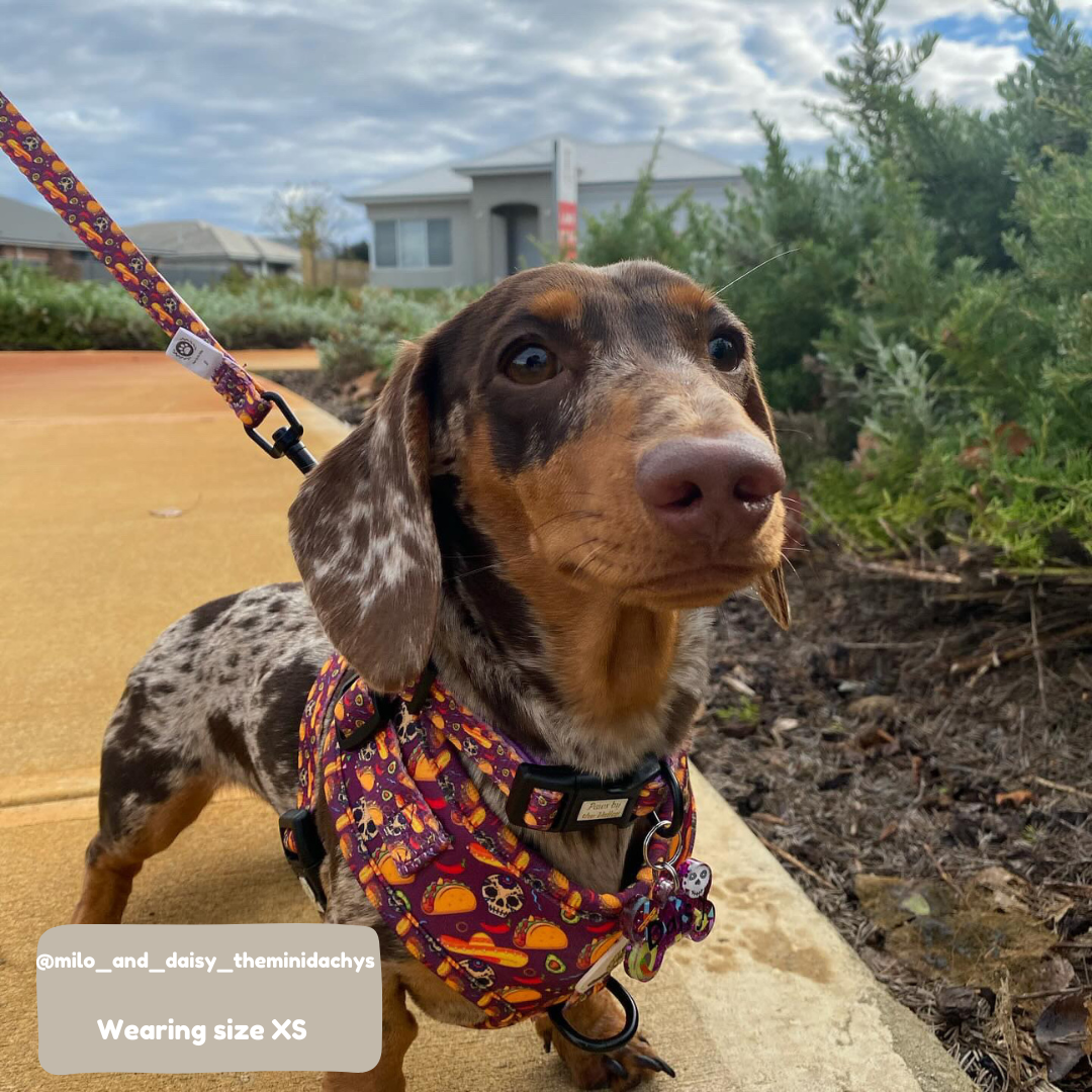 We love this Harness! Not only does it feature the most beautiful purple colour with a super fun pattern, but it is also super practical and easy to use! The quality is really great! Daisy is wearing an XS, which fits perfectly thanks to the easy adjustments. Run, Don’t walk!